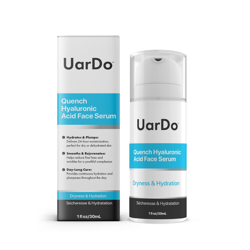 What it is: Plunge into deep hydration and reflective shine with Uardo Quench Hyaluronic Acid Serum. Specially formulated with a potent blend of Hydrolyzed Hyaluronic Acid and Sodium Hyaluronate, this serum infuses your skin with intense moisture, helps to maintain hydration levels, and visibly plumps for a smooth, dewy complexion. The added benefit of Niacinamide improves skin texture, reduces pore size, and diminishes the appearance of fine lines.